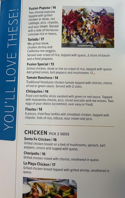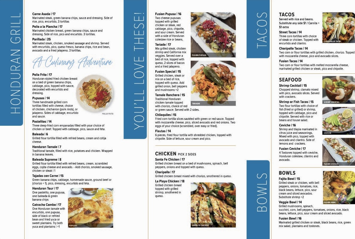 Two cheese pupusas topped with grilled chicken or steak, lettuce, red cabbage, pico, chipotle, and sour cream. Served with a side of Honduran coleslaw and rice or beans