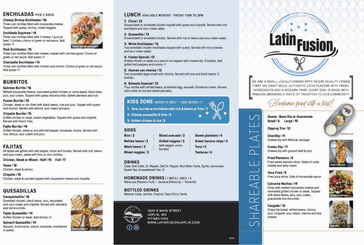 Looking for a unique dining experience? The Latin Fusion Menu at 1520 S Main St in Joplin, MO, brings together the vibrant flavors of Latin America with a contemporary twist. From mouth-watering tacos to sizzling fajitas, every dish is packed with bold, exciting flavors. Whether you're craving a zesty ceviche or a rich mole, each bite offers a taste of both tradition and innovation. The mix of fresh ingredients and fusion cooking techniques makes for a dining experience that's both familiar and new. Whether you're here for a quick lunch or a relaxed dinner, the menu is sure to satisfy a range of tastes with its mix of spice, sweetness, and savory perfection.