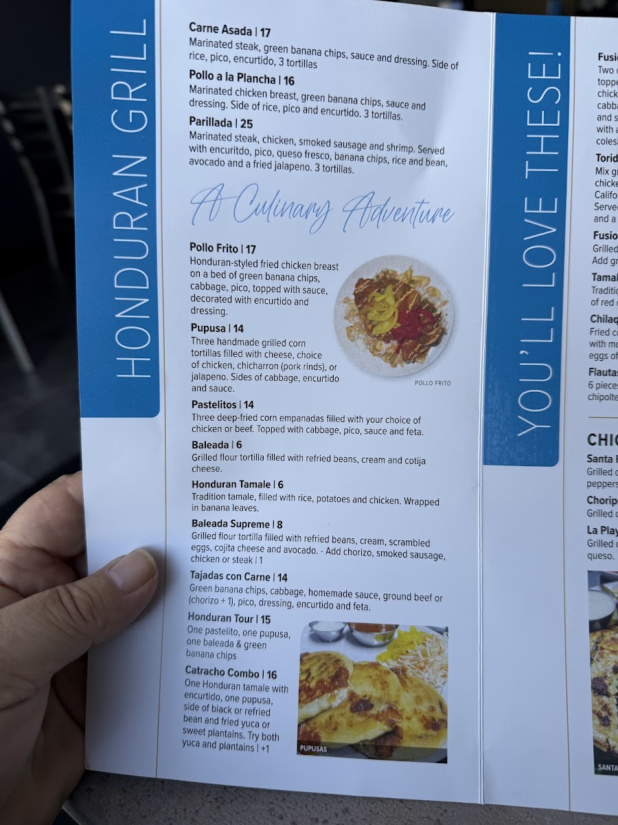 Traditional Honduran chicken tamale topped with chorizo and choice of red or green sauce or queso. Served with 2 sides